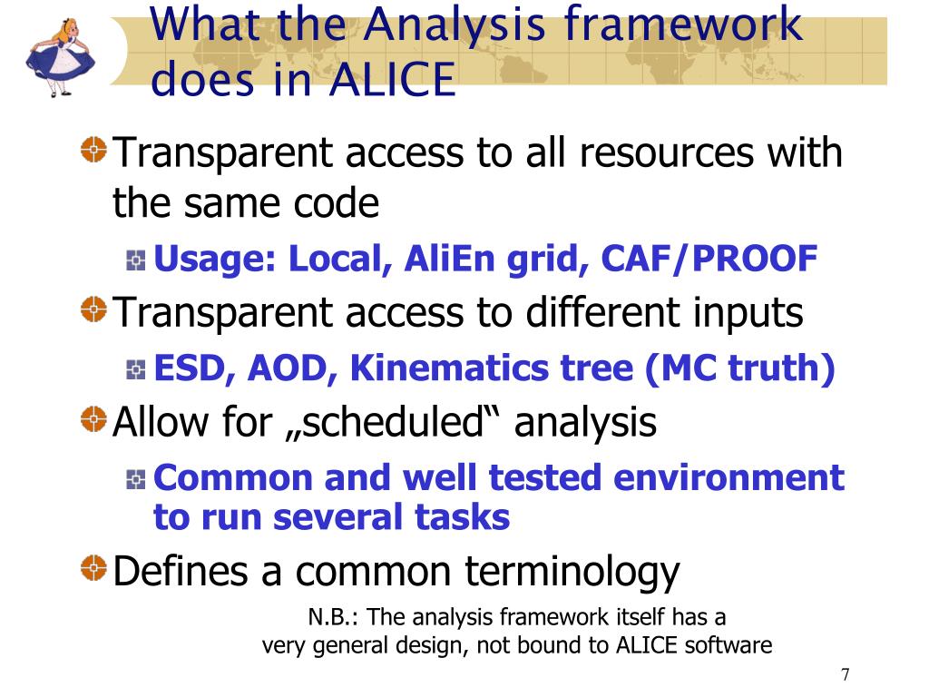 The Basics:What the Analysis framework does in ALICE • Transparent access to all resources with the same code • Usage: Local, AliEn grid, CAF/PROOF • Transparent access to different inputs • ESD, AOD, Kinematics tree (MC truth) • Allow for „scheduled“ analysis • Common and well tested environment to run several tasks • Defines a common terminology N.B.: The analysis framework itself has a very general design, not bound to ALICE software