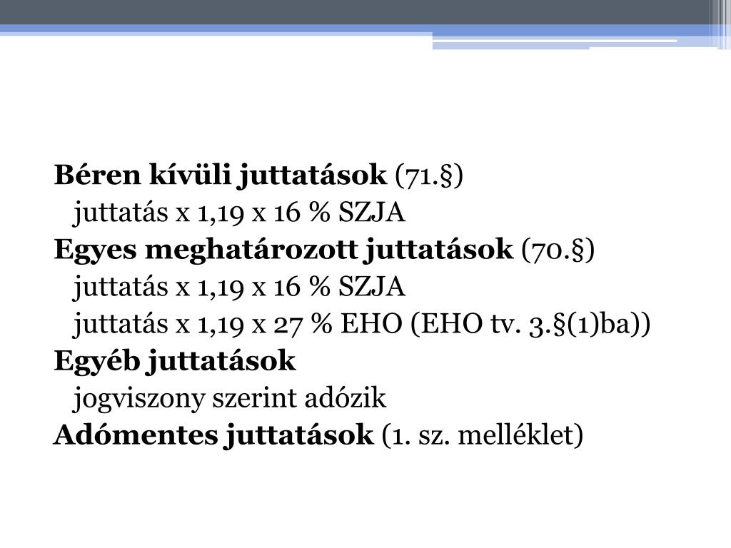 Béren kívüli juttatások (71.§) juttatás x 1,19 x 16 % SZJA Egyes meghatározott juttatások (70.§) juttatás x 1,19 x 16 % SZJA juttatás x 1,19 x 27 % EHO (EHO tv. 3.§(1)ba)) Egyéb juttatások jogviszony szerint adózik Adómentes juttatások (1. sz. melléklet)