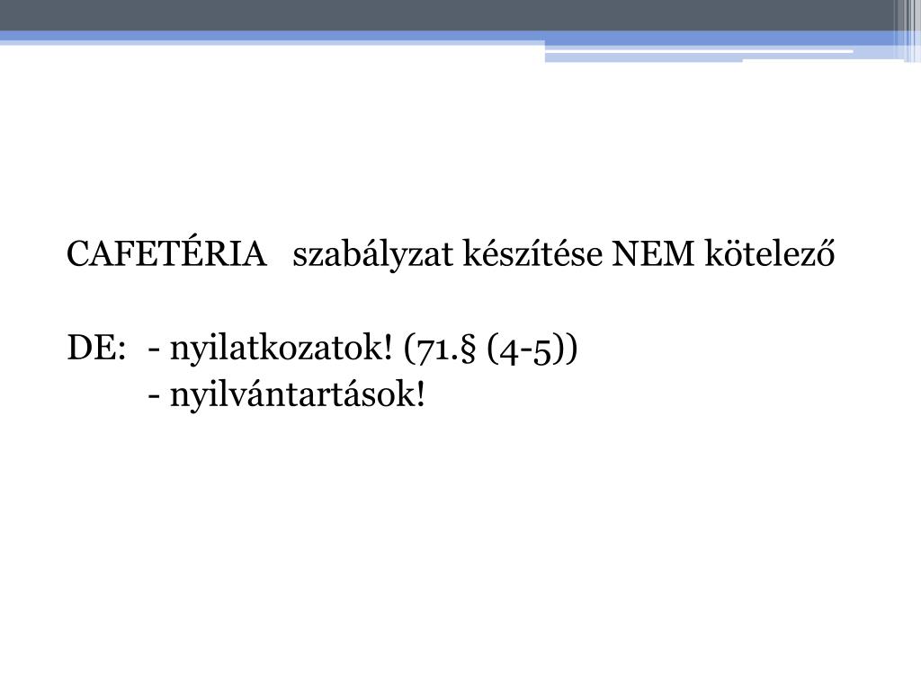CAFETÉRIA szabályzat készítése NEM kötelező DE: - nyilatkozatok! (71.§ (4-5)) - nyilvántartások!