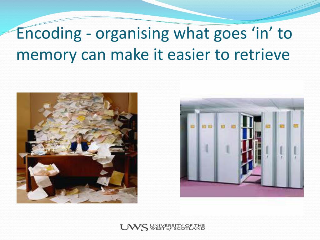 Encoding - organising what goes ‘in’ to memory can make it easier to retrieve