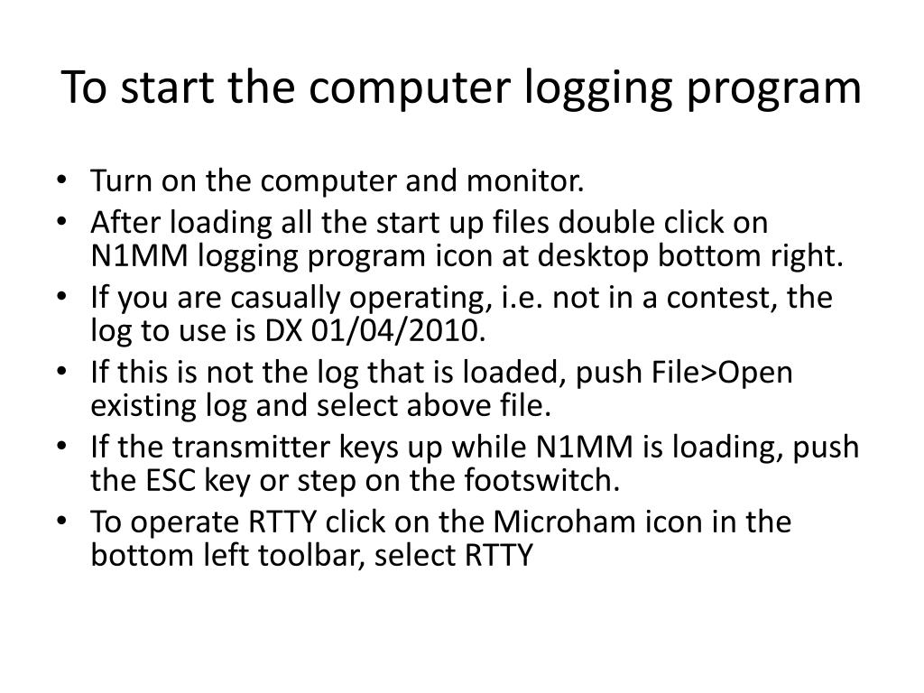 To start the computer logging program • Turn on the computer and monitor. • After loading all the start up files double click on N1MM logging program icon at desktop bottom right. • If you are casually operating, i.e. not in a contest, the log to use is DX 01/04/2010. • If this is not the log that is loaded, push File>Open existing log and select above file. • If the transmitter keys up while N1MM is loading, push the ESC key or step on the footswitch. • To operate RTTY click on the Microham icon in the bottom left toolbar, select RTTY