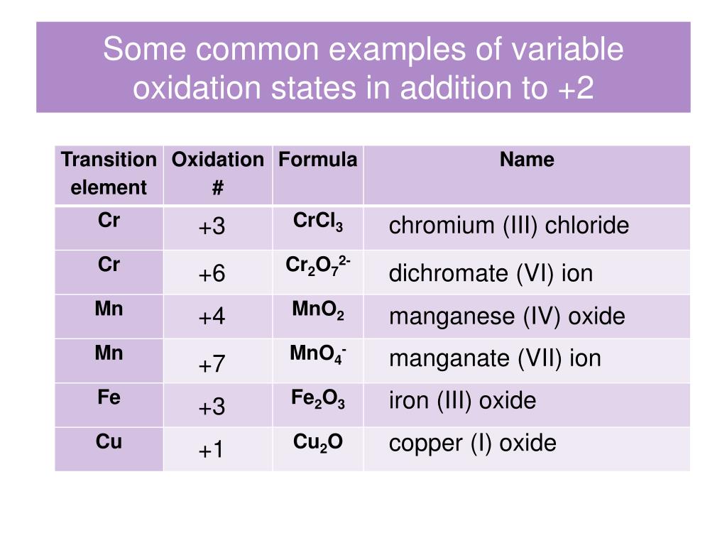 Some common examples of variable oxidation states in addition to +2 chromium (III) chloride +3 +6 dichromate (VI) ion +4 manganese (IV) oxide manganate (VII) ion +7 iron (III) oxide +3 copper (I) oxide +1