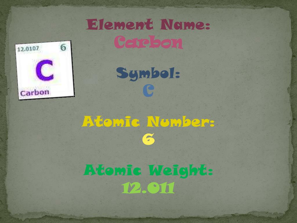 Element Name: Carbon Symbol: C Atomic Number: 6 Atomic Weight: 12.011
