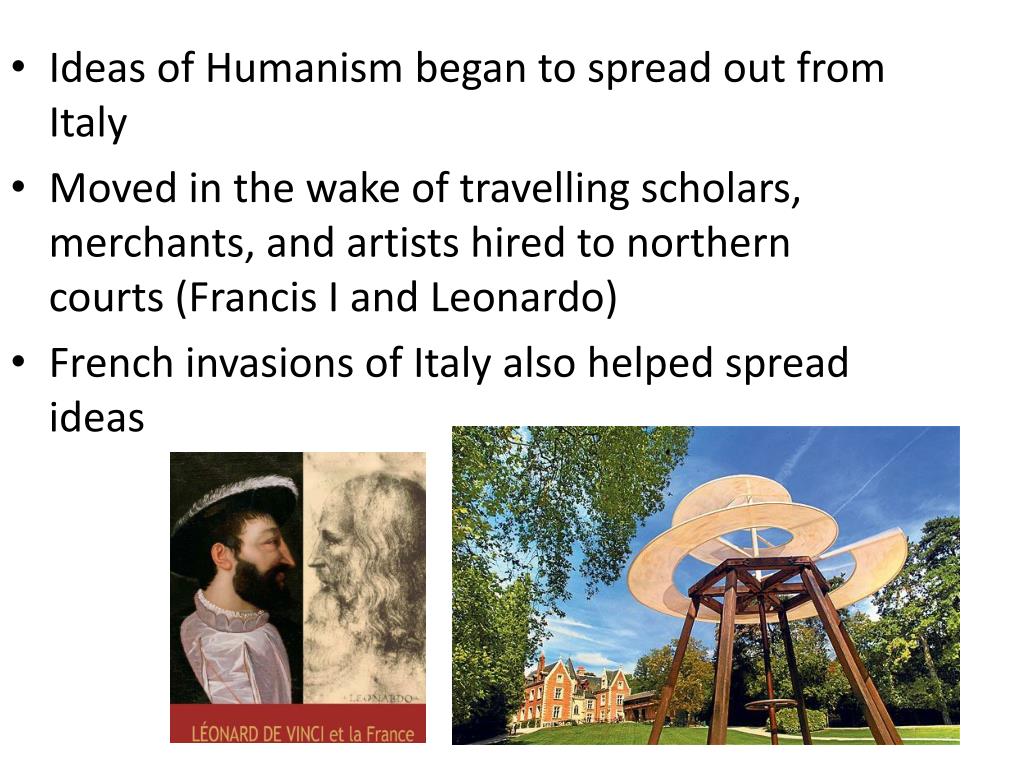 Ideas of Humanism began to spread out from Italy Moved in the wake of travelling scholars, merchants, and artists hired to northern courts (Francis I and Leonardo) French invasions of Italy also helped spread ideas