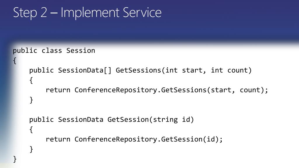 Step 2 – Implement Service • public class Session • { • public SessionData[] GetSessions(int start, int count) • { • return ConferenceRepository.GetSessions(start, count); • } • public SessionDataGetSession(string id) • { • return ConferenceRepository.GetSession(id); • } • }