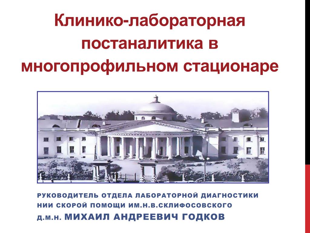 Клинико-лабораторная постаналитика в многопрофильном стационаре. Руководитель Отдела лабораторной диагностики Нии скоРОЙ ПОМОЩИ ИМ.н.в.сКЛИФОСОВСКОГО д.м.н. Михаил Андреевич Годков. Характеристика НИИ СП.