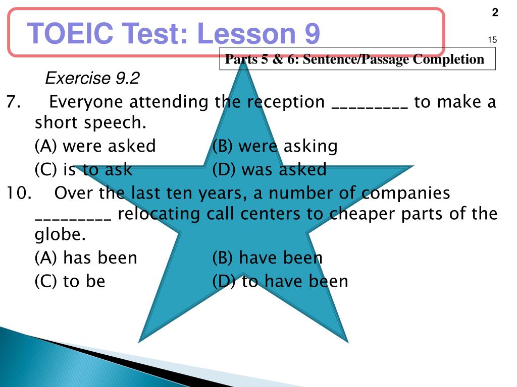 2 TOEIC Test: Lesson 9 15 Parts 5 & 6: Sentence/Passage Completion Exercise 9.2 7. Everyone attending the reception _________ to make a short speech. (A) were asked (B) were asking (C) is to ask (D) was asked 10. Over the last ten years, a number of companies _________ relocating call centers to cheaper parts of the globe. (A) has been (B) have been (C) to be (D) to have been