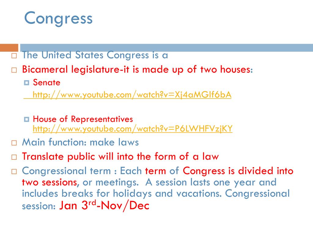 Congress • The United States Congress is a • Bicameral legislature-it is made up of two houses: • Senate http://www.youtube.com/watch?v=Xj4aMGlf6bA • House of Representatives http://www.youtube.com/watch?v=P6LWHFVzjKY • Main function: make laws • Translate public will into the form of a law • Congressional term : Each term of Congress is divided into two sessions, or meetings. A session lasts one year and includes breaks for holidays and vacations. Congressional session: Jan 3rd-Nov/Dec