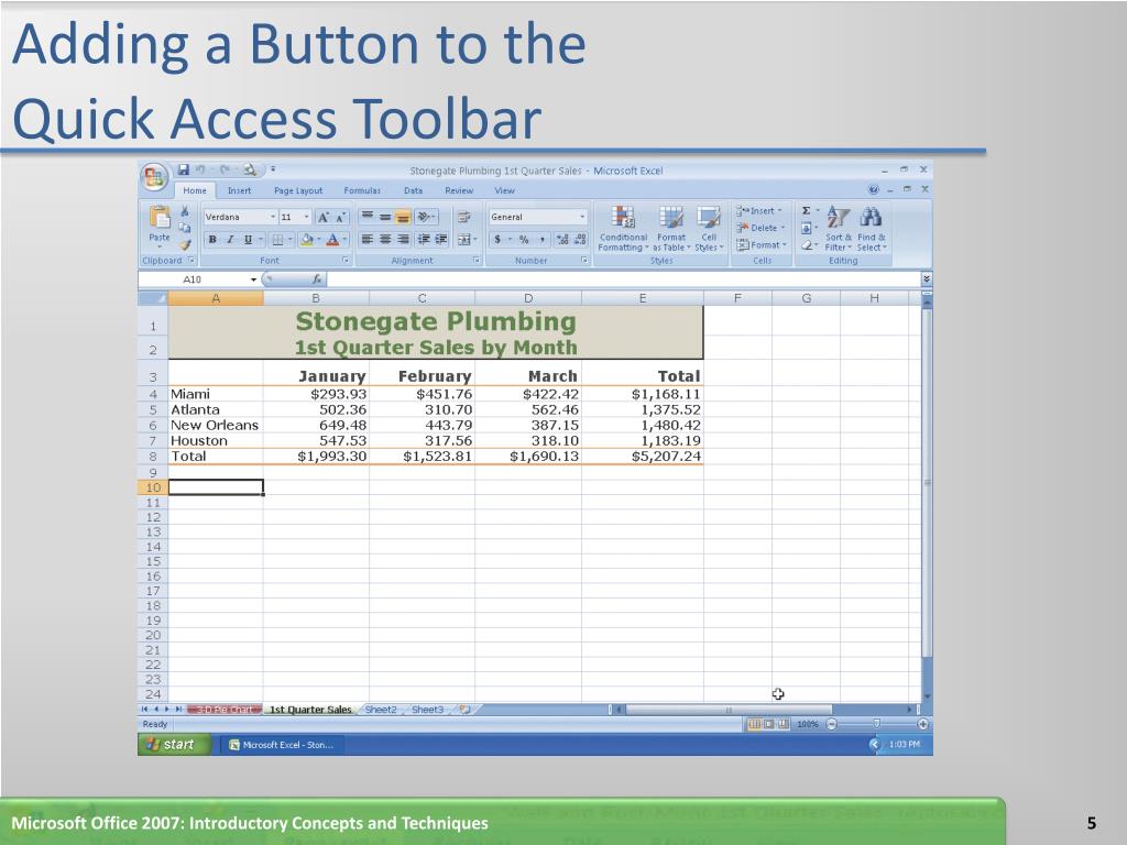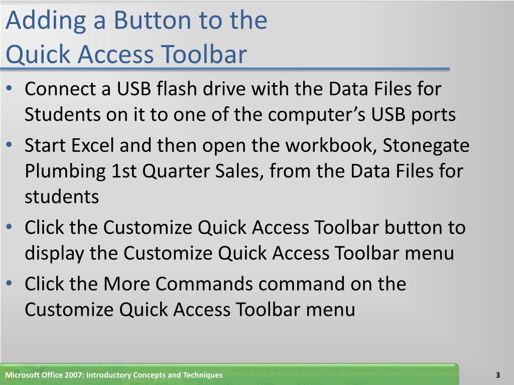 Adding a Button to the Quick Access Toolbar • Connect a USB flash drive with the Data Files for Students on it to one of the computer’s USB ports • Start Excel and then open the workbook, Stonegate Plumbing 1st Quarter Sales, from the Data Files for students • Click the Customize Quick Access Toolbar button to display the Customize Quick Access Toolbar menu • Click the More Commands command on the Customize Quick Access Toolbar menu Microsoft Office 2007: Introductory Concepts and Techniques
