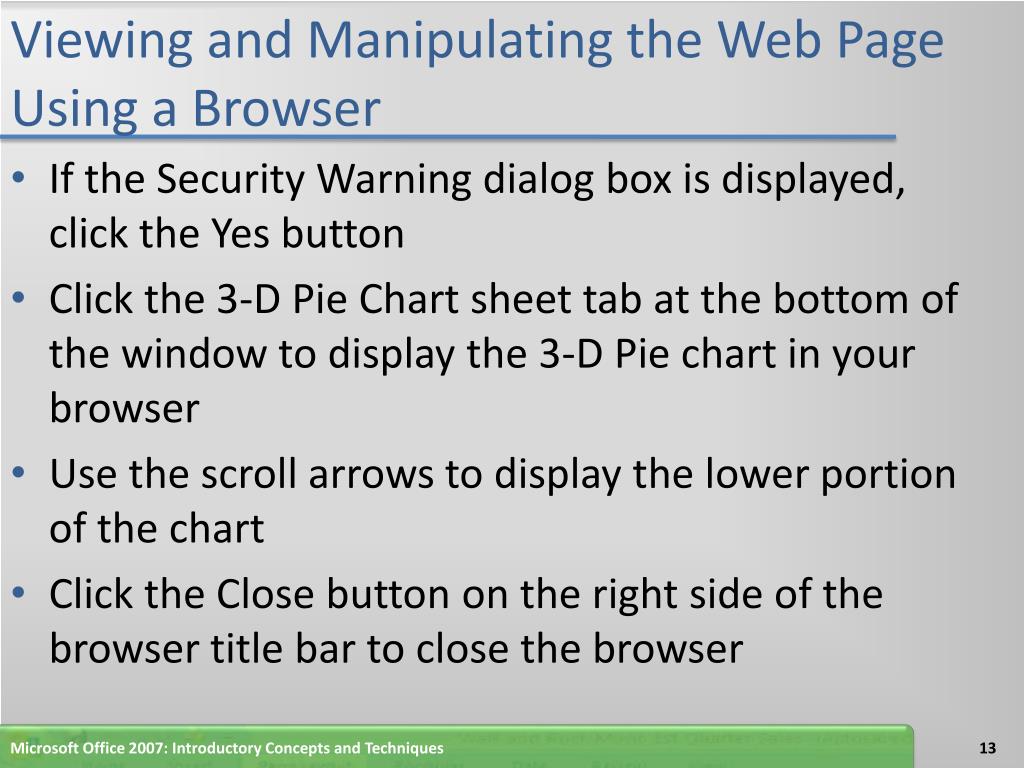 Viewing and Manipulating the Web Page Using a Browser • If the Security Warning dialog box is displayed, click the Yes button • Click the 3-D Pie Chart sheet tab at the bottom of the window to display the 3-D Pie chart in your browser • Use the scroll arrows to display the lower portion of the chart • Click the Close button on the right side of the browser title bar to close the browser Microsoft Office 2007: Introductory Concepts and Techniques