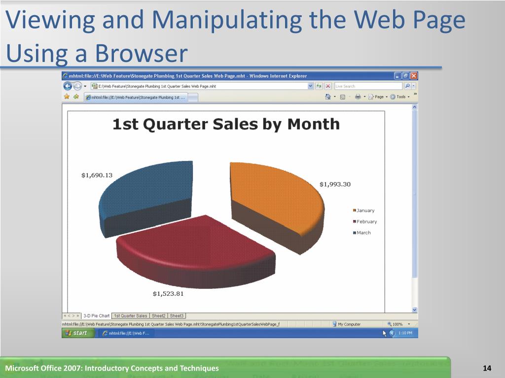 Viewing and Manipulating the Web Page Using a Browser • If necessary, connect the USB flash drive with the Data Files for Students to one of the computer’s USB ports • Click the Start button on the Windows taskbar, point to All Programs on the Start menu, and then click Internet Explorer in the All Programs submenu • When the Internet Explorer window opens, type e:\web feature\stonegate plumbing 1st quarter sales web page.mht in the Address box and then press the ENTER key to display the Web page in your browser • If the Information Bar appears, right-click it and then click Allow Blocked Content on the shortcut menu Microsoft Office 2007: Introductory Concepts and Techniques