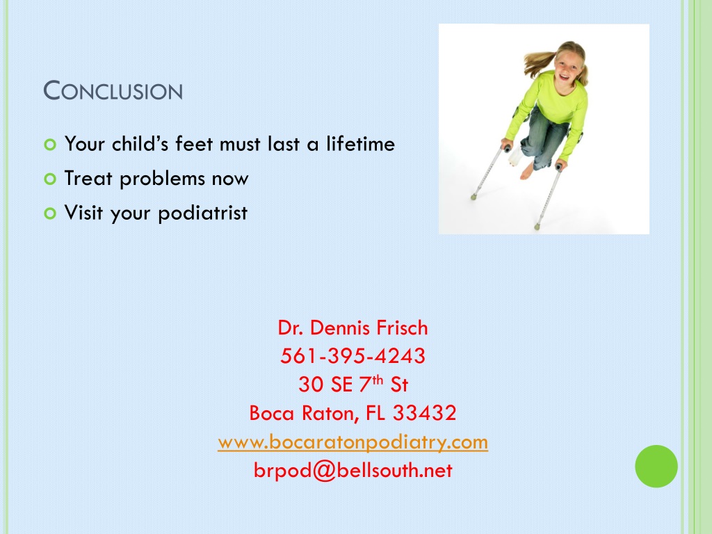 Conclusion • Your child’s feet must last a lifetime • Treat problems now • Visit your podiatrist Dr. Dennis Frisch 561-395-4243 30 SE 7th St Boca Raton, FL 33432 www.bocaratonpodiatry.com brpod@bellsouth.net