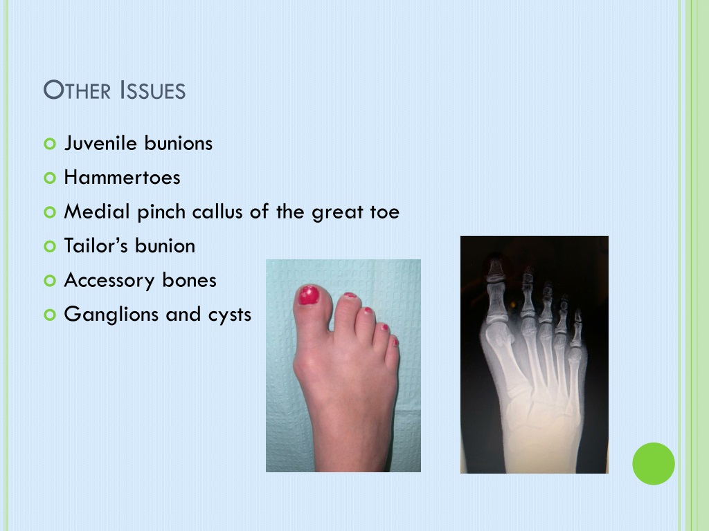 Other Issues • Juvenile bunions • Hammertoes • Medial pinch callus of the great toe • Tailor’s bunion • Accessory bones • Ganglions and cysts