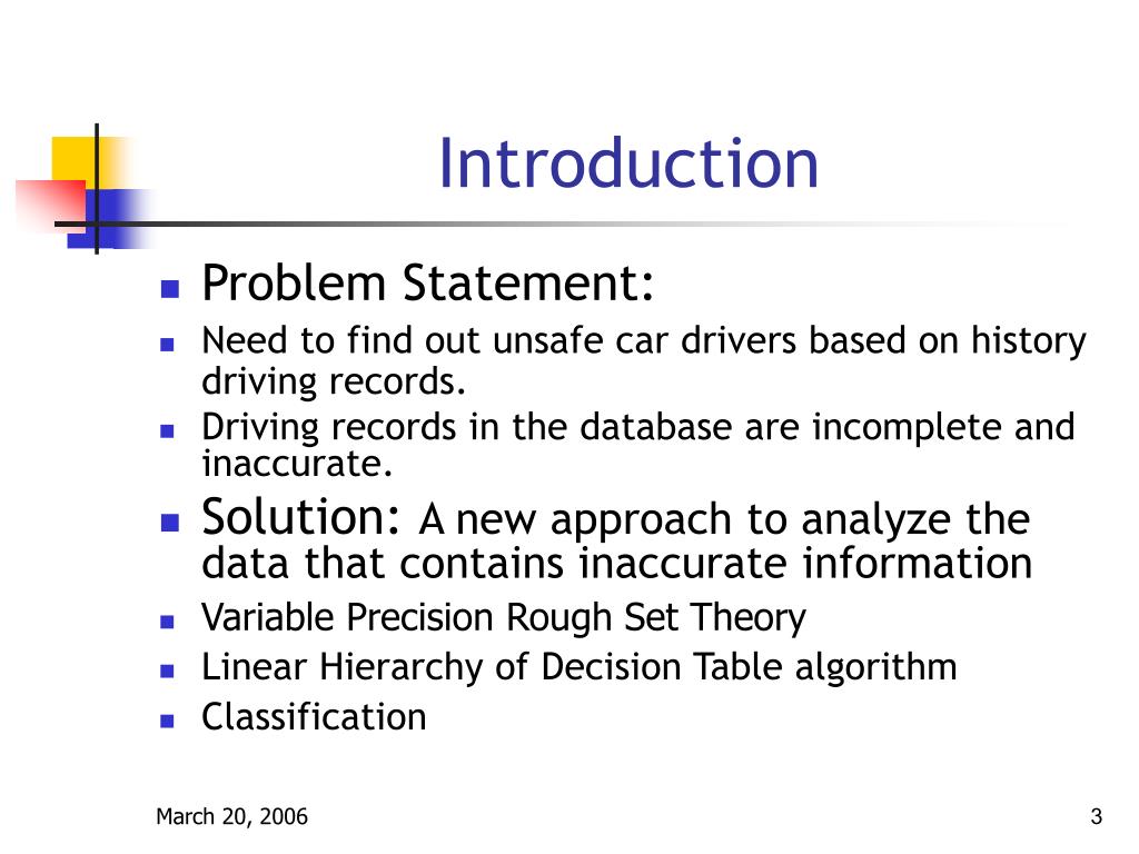 Introduction • Problem Statement: • Need to find out unsafe car drivers based on history driving records. • Driving records in the database are incomplete and inaccurate. • Solution: A new approach to analyze the data that contains inaccurate information • Variable Precision Rough Set Theory • Linear Hierarchy of Decision Table algorithm • Classification