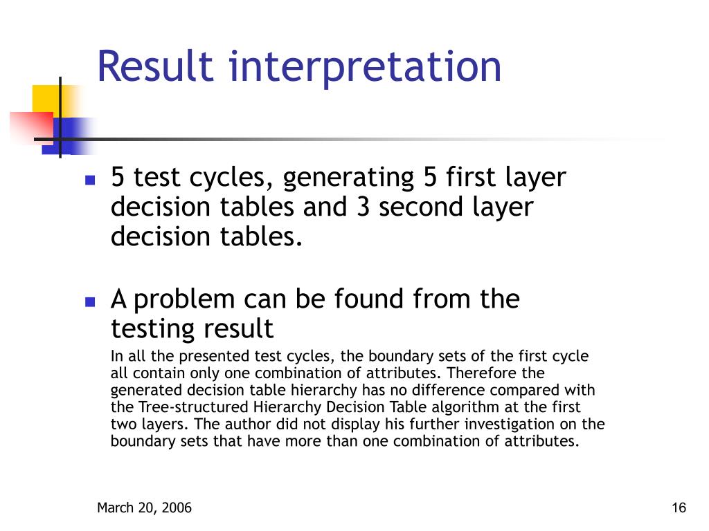 Result interpretation • 5 test cycles, generating 5 first layer decision tables and 3 second layer decision tables. • A problem can be found from the testing result In all the presented test cycles, the boundary sets of the first cycle all contain only one combination of attributes. Therefore the generated decision table hierarchy has no difference compared with the Tree-structured Hierarchy Decision Table algorithm at the first two layers. The author did not display his further investigation on the boundary sets that have more than one combination of attributes.