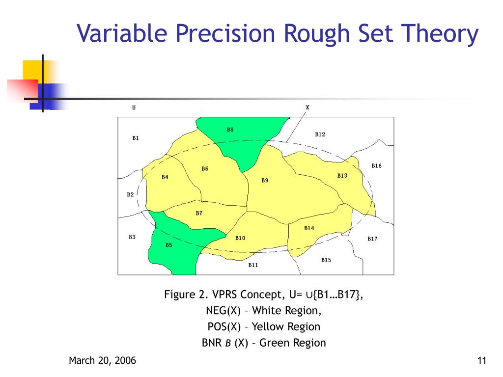 Variable Precision Rough Set Theory Figure 2. VPRS Concept, U= ∪{B1…B17}, NEG(X) – White Region, POS(X) – Yellow Region BNR B (X) – Green Region