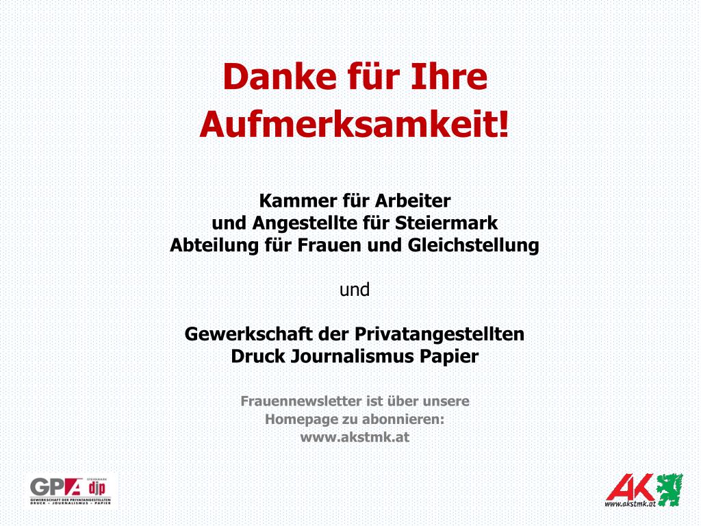 Danke für Ihre Aufmerksamkeit! Kammer für Arbeiter und Angestellte für Steiermark Abteilung für Frauen und Gleichstellung und Gewerkschaft der Privatangestellten Druck Journalismus Papier Frauennewsletter ist über unsere Homepage zu abonnieren: www.akstmk.at