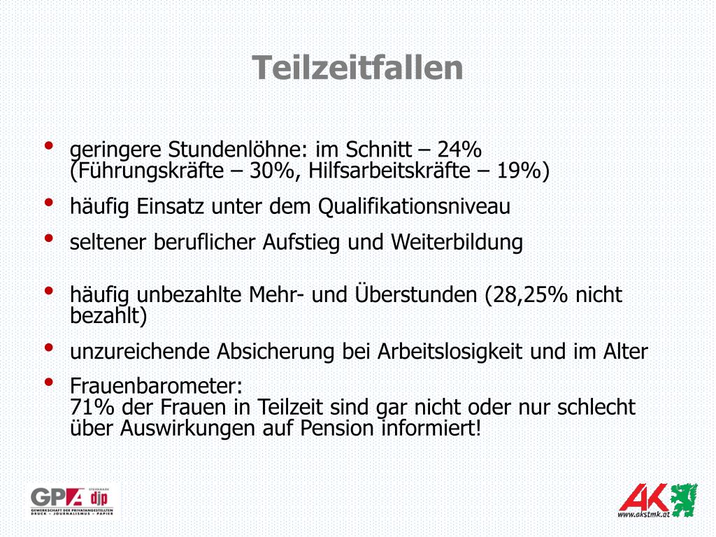 Teilzeitfallen • geringere Stundenlöhne: im Schnitt – 24%(Führungskräfte – 30%, Hilfsarbeitskräfte – 19%) • häufig Einsatz unter dem Qualifikationsniveau • seltener beruflicher Aufstieg und Weiterbildung • häufig unbezahlte Mehr- und Überstunden (28,25% nicht bezahlt) • unzureichende Absicherung bei Arbeitslosigkeit und im Alter • Frauenbarometer: 71% der Frauen in Teilzeit sind gar nicht oder nur schlecht über Auswirkungen auf Pension informiert!