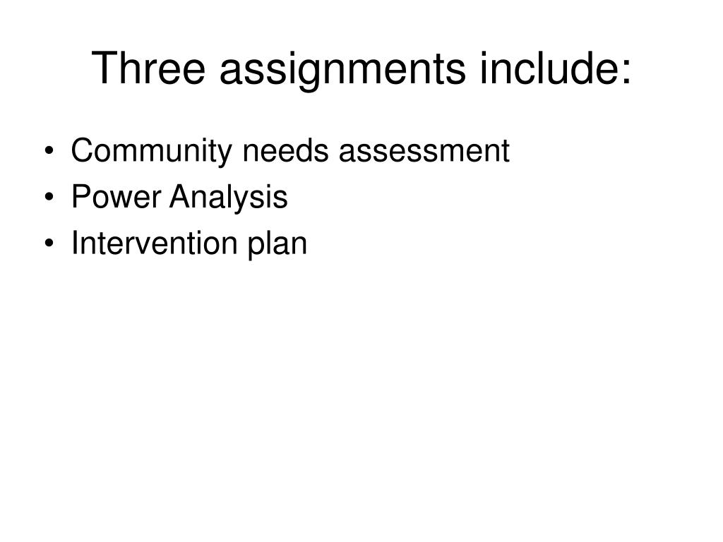 Three assignments include: • Community needs assessment • Power Analysis • Intervention plan