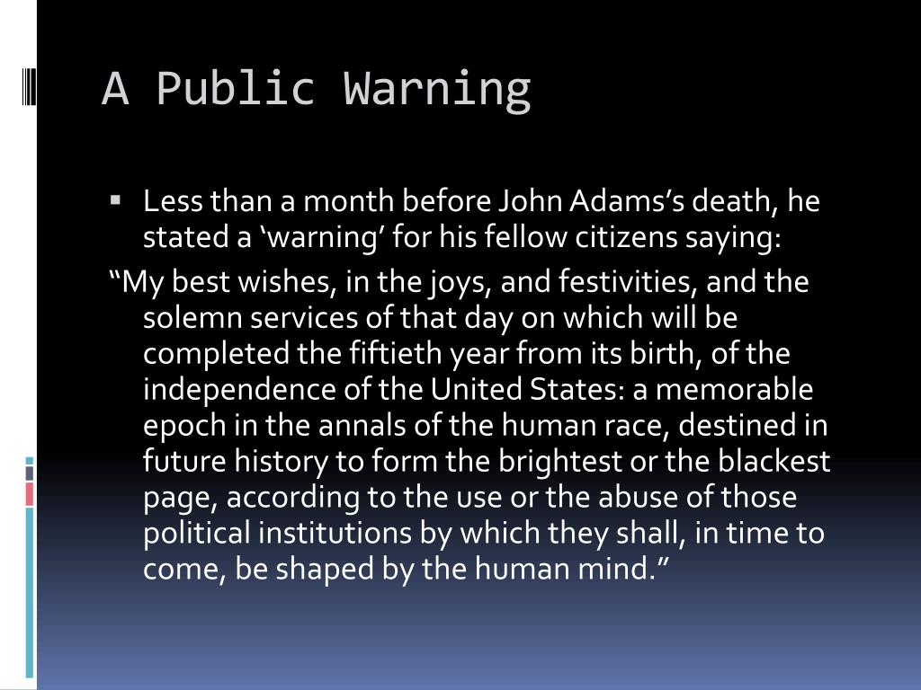A Public Warning • Less than a month before John Adams’s death, he stated a ‘warning’ for his fellow citizens saying: “My best wishes, in the joys, and festivities, and the solemn services of that day on which will be completed the fiftieth year from its birth, of the independence of the United States: a memorable epoch in the annals of the human race, destined in future history to form the brightest or the blackest page, according to the use or the abuse of those political institutions by which they shall, in time to come, be shaped by the human mind.”