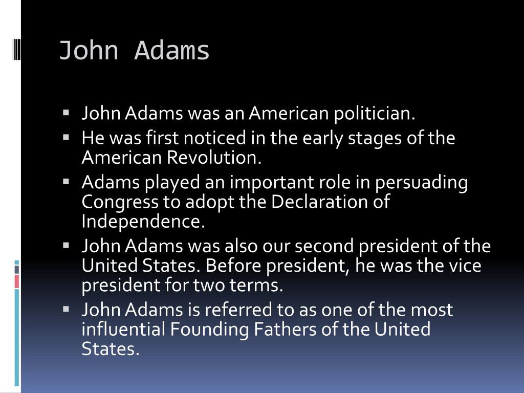 John Adams • John Adams was an American politician. • He was first noticed in the early stages of the American Revolution. • Adams played an important role in persuading Congress to adopt the Declaration of Independence. • John Adams was also our second president of the United States. Before president, he was the vice president for two terms. • John Adams is referred to as one of the most influential Founding Fathers of the United States.