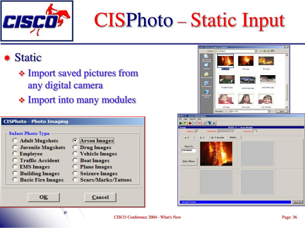 CISPhoto – Integration • CAPS • JAMS • TIES • FIRES • EMS • HOMELAND SECURITY • WARRANTS/CIVIL PROCESS • PERSONNEL CISCO Conference 2004 - What's New