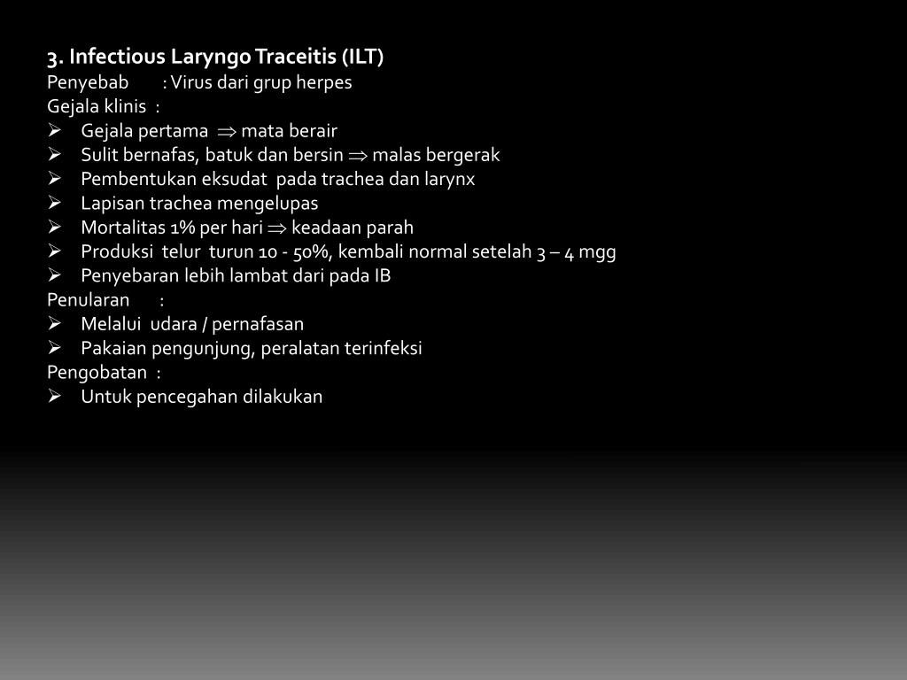 3. Infectious LaryngoTraceitis (ILT) • Penyebab : Virus darigrup herpes • Gejalaklinis: • Gejalapertama mataberair • Sulitbernafas, batukdanbersin malasbergerak • Pembentukaneksudatpada trachea dan larynx • Lapisan trachea mengelupas • Mortalitas 1% per hari keadaanparah • Produksitelurturun10 - 50%, kembali normal setelah 3 – 4 mgg • Penyebaranlebihlambatdaripada IB • Penularan: • Melaluiudara/ pernafasan • Pakaianpengunjung, peralatanterinfeksi • Pengobatan : • Untukpencegahandilakukan