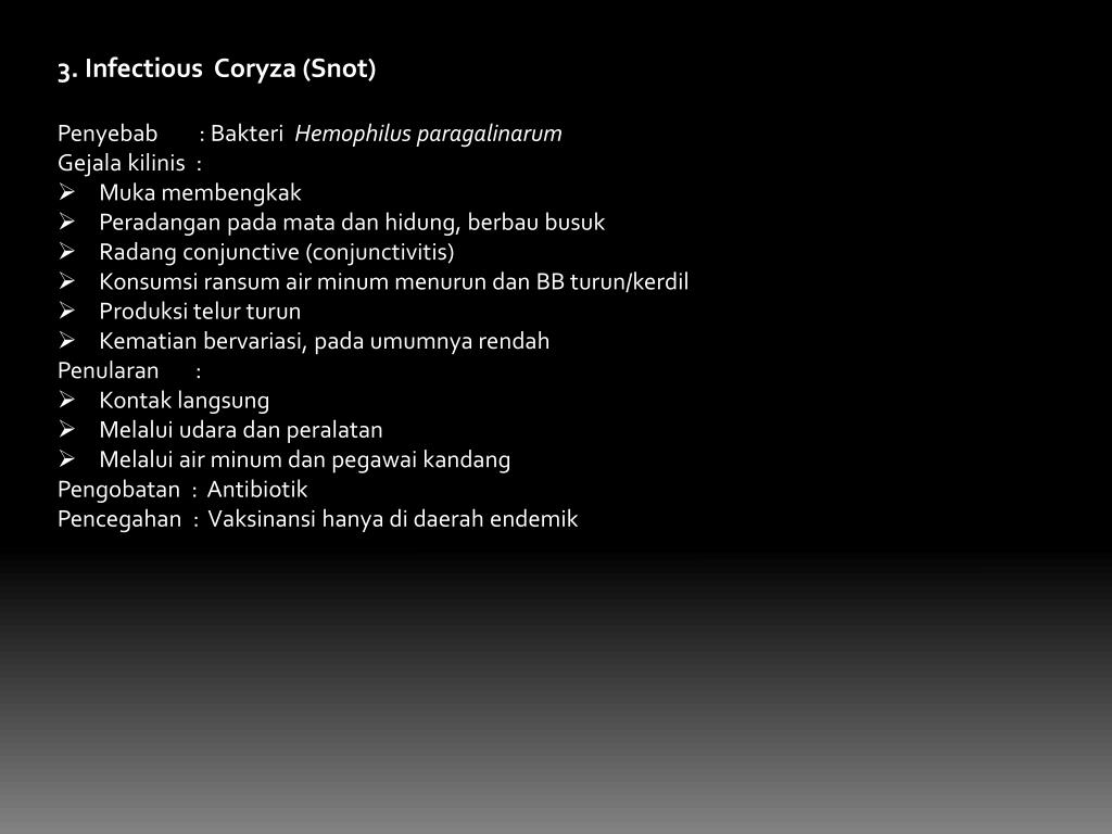 3. Infectious Coryza (Snot) • Penyebab: Bakteri Hemophilus paragalinarum • Gejalakilinis : • Muka membengkak • Peradangan pada mata dan hidung, berbau busuk • Radang conjunctive (conjunctivitis) • Konsumsi ransum air minum menurun dan BB turun/kerdil • Produksi telur turun • Kematian bervariasi, pada umumnya rendah • Penularan: • Kontak langsung • Melalui udara dan peralatan • Melalui air minum dan pegawai kandang • Pengobatan : Antibiotik • Pencegahan : Vaksinansi hanya di daerah endemik