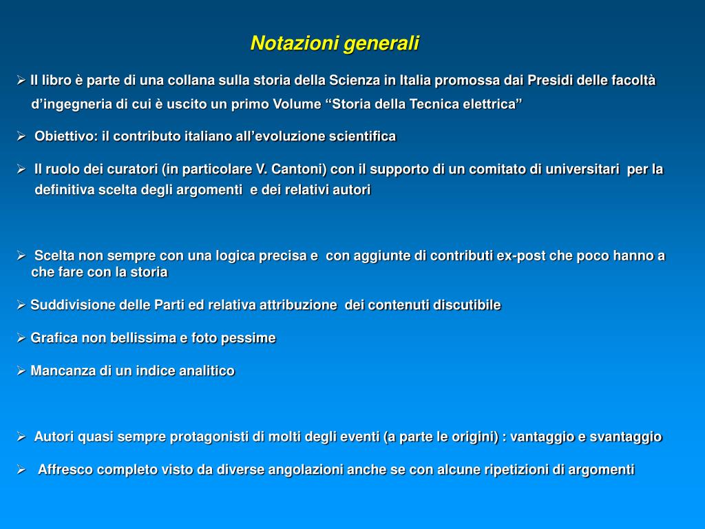 Notazioni generali • Il libro è parte di una collana sulla storia della Scienza in Italia promossa dai Presidi delle facoltà d’ingegneria di cui è uscito un primo Volume “Storia della Tecnica elettrica” • Obiettivo: il contributo italiano all’evoluzione scientifica • Il ruolo dei curatori (in particolare V. Cantoni) con il supporto di un comitato di universitari per la definitiva scelta degli argomenti e dei relativi autori • Scelta non sempre con una logica precisa e con aggiunte di contributi ex-post che poco hanno a che fare con la storia • Suddivisione delle Parti ed relativa attribuzione dei contenuti discutibile • Grafica non bellissima e foto pessime • Mancanza di un indice analitico • Autori quasi sempre protagonisti di molti degli eventi (a parte le origini) : vantaggio e svantaggio • Affresco completo visto da diverse angolazioni anche se con alcune ripetizioni di argomenti