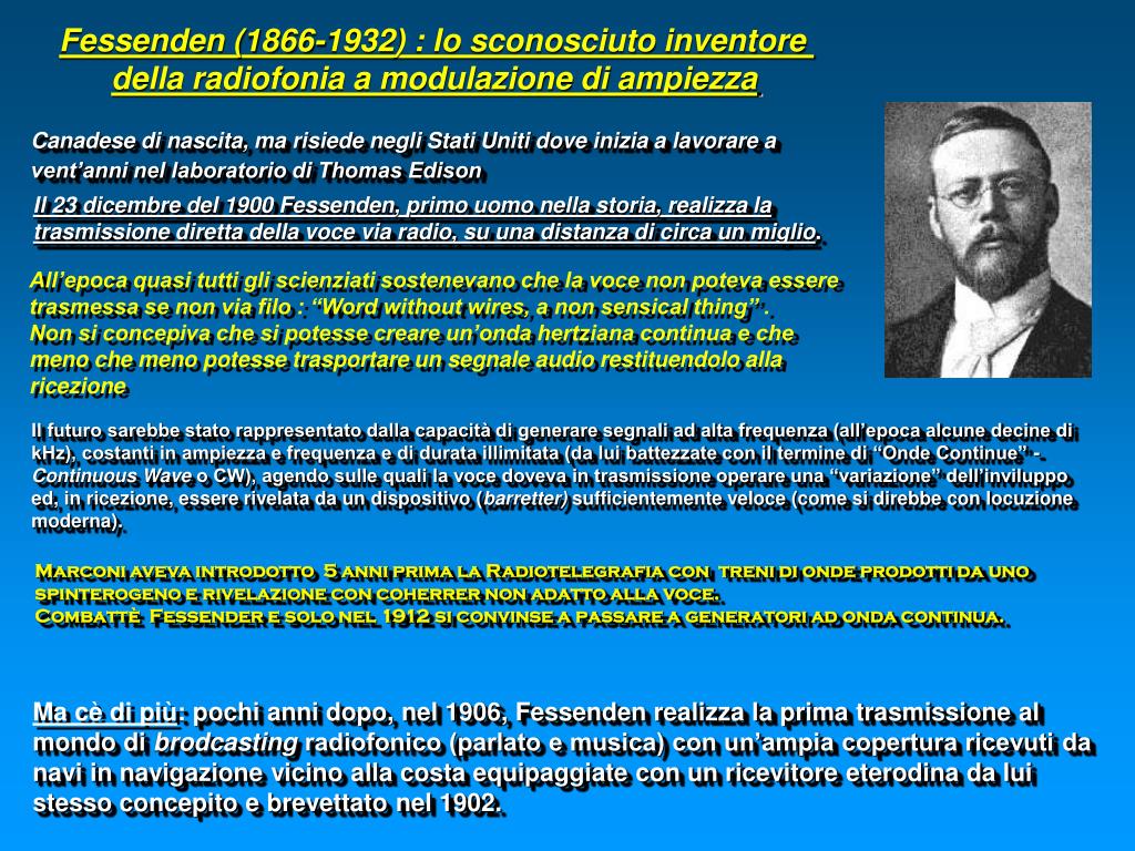 Canadese di nascita, ma risiede negli Stati Uniti dove inizia a lavorare a vent’anni nel laboratorio di Thomas Edison Fessenden (1866-1932) : lo sconosciuto inventore della radiofonia a modulazione di ampiezza Il 23 dicembre del 1900 Fessenden, primo uomo nella storia, realizza la trasmissione diretta della voce via radio, su una distanza di circa un miglio. All’epoca quasi tutti gli scienziati sostenevano che la voce non poteva essere trasmessa se non via filo : “Word without wires, a non sensical thing” . Non si concepiva che si potesse creare un’onda hertziana continua e che meno che meno potesse trasportare un segnale audio restituendolo alla ricezione Il futuro sarebbe stato rappresentato dalla capacità di generare segnali ad alta frequenza (all’epoca alcune decine di kHz), costanti in ampiezza e frequenza e di durata illimitata (da lui battezzate con il termine di “Onde Continue” - Continuous Wave o CW), agendo sulle quali la voce doveva in trasmissione operare una “variazione” dell’inviluppo ed, in ricezione, essere rivelata da un dispositivo (barretter) sufficientemente veloce (come si direbbe con locuzione moderna). Marconi aveva introdotto 5 anni prima la Radiotelegrafia con treni di onde prodotti da uno spinterogeno e rivelazione con coherrer non adatto alla voce. Combattè Fessender e solo nel 1912 si convinse a passare a generatori ad onda continua. Ma cè di più: pochi anni dopo, nel 1906, Fessenden realizza la prima trasmissione al mondo di brodcasting radiofonico (parlato e musica) con un’ampia copertura ricevuti da navi in navigazione vicino alla costa equipaggiate con un ricevitore eterodina da lui stesso concepito e brevettato nel 1902.