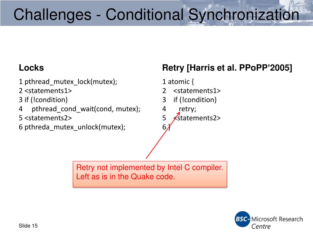 Challenges - Conditional Synchronization Locks Retry [Harris et al. PPoPP’2005] 1 pthread_mutex_lock(mutex); 2 <statements1> 3 if (!condition) 4 pthread_cond_wait(cond, mutex); 5 <statements2> 6 pthreda_mutex_unlock(mutex); 1 atomic { 2 <statements1> 3 if (!condition) 4 retry; 5 <statements2> 6 } Retry not implemented by Intel C compiler. Left as is in the Quake code.