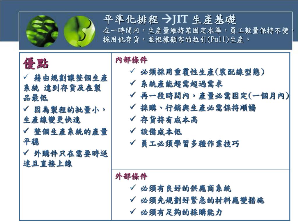 平準化排程JIT 生產基礎在一時間內,生產量維持某固定水準,員工數量保持不變,採用低存貨,並根據顧客的拉引(Pull)生產。