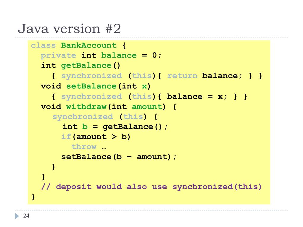 Java version #2 classBankAccount { privateintbalance = 0; • intgetBalance() • { synchronized (this){ return balance; } } • void setBalance(intx) • { synchronized (this){balance = x; } } void withdraw(intamount) { • synchronized (this) { • intb = getBalance(); if(amount > b) throw … setBalance(b – amount); } } // deposit would also use synchronized(this) }