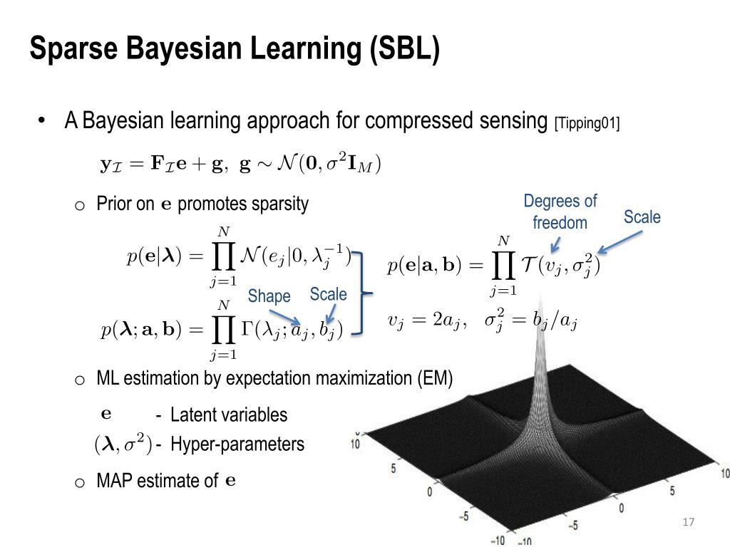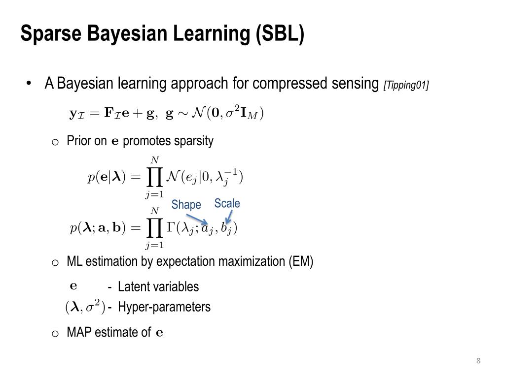 Sparse Bayesian Learning (SBL) • A Bayesian learning approach for compressed sensing [Tipping01] • Prior on promotes sparsity • ML estimation by expectation maximization (EM) - Latent variables - Hyper-parameters • MAP estimate of Scale Shape