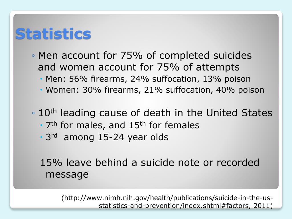 Men account for 75% of completed suicides and women account for 75% of attempts • Men: 56% firearms, 24% suffocation, 13% poison • Women: 30% firearms, 21% suffocation, 40% poison • 10th leading cause of death in the United States • 7th for males, and 15th for females • 3rd among 15-24 year olds 15% leave behind a suicide note or recorded message (http://www.nimh.nih.gov/health/publications/suicide-in-the-us-statistics-and-prevention/index.shtml#factors, 2011) Statistics