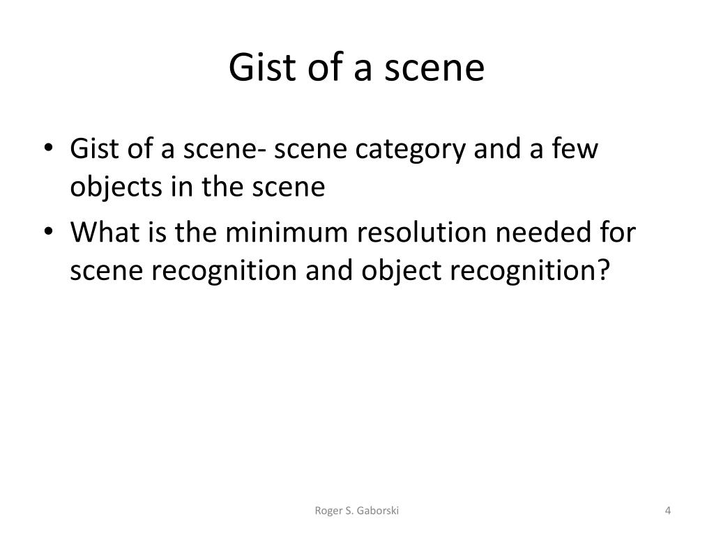 Gist of a scene • Gist of a scene- scene category and a few objects in the scene • What is the minimum resolution needed for scene recognition and object recognition? Roger S. Gaborski