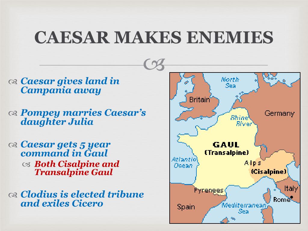 CAESAR MAKES ENEMIES • Caesar gives land in Campania away • Pompey marries Caesar’s daughter Julia • Caesar gets 5 year command in Gaul • Both Cisalpine and Transalpine Gaul • Clodius is elected tribune and exiles Cicero