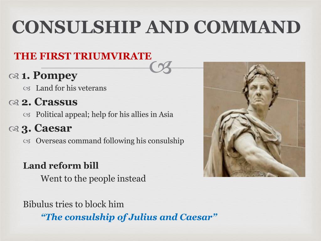 CONSULSHIP AND COMMAND THE FIRST TRIUMVIRATE • 1. Pompey • Land for his veterans • 2. Crassus • Political appeal; help for his allies in Asia • 3. Caesar • Overseas command following his consulship Land reform bill Went to the people instead Bibulus tries to block him “The consulship of Julius and Caesar”