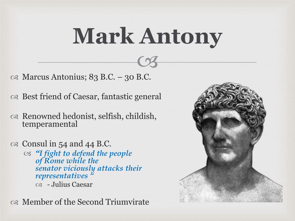 Mark Antony • Marcus Antonius; 83 B.C. – 30 B.C. • Best friend of Caesar, fantastic general • Renowned hedonist, selfish, childish, temperamental • Consul in 54 and 44 B.C. • “I fight to defend the people of Rome while the senator viciously attacks their representatives “ • - Julius Caesar • Member of the Second Triumvirate