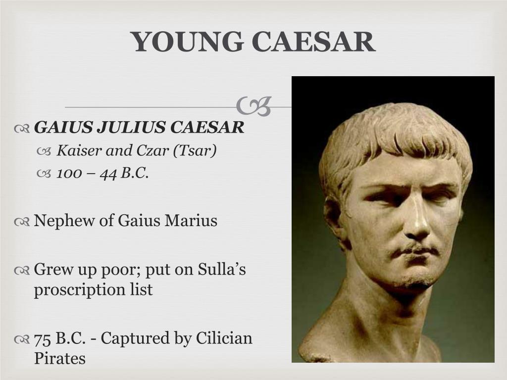 YOUNG CAESAR • GAIUS JULIUS CAESAR • Kaiser and Czar (Tsar) • 100 – 44 B.C. • Nephew of Gaius Marius • Grew up poor; put on Sulla’s proscription list • 75 B.C. - Captured by Cilician Pirates