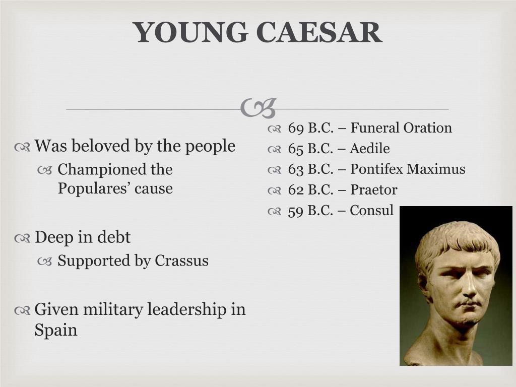 YOUNG CAESAR • Was beloved by the people • Championed the Populares’ cause • Deep in debt • Supported by Crassus • Given military leadership in Spain • 69 B.C. – Funeral Oration • 65 B.C. – Aedile • 63 B.C. – Pontifex Maximus • 62 B.C. – Praetor • 59 B.C. – Consul