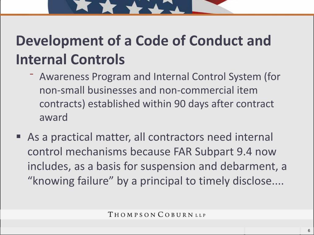 Development of a Code of Conduct and Internal Controls • Awareness Program and Internal Control System (for non-small businesses and non-commercial item contracts) established within 90 days after contract award • As a practical matter, all contractors need internal control mechanisms because FAR Subpart 9.4 now includes, as a basis for suspension and debarment, a “knowing failure” by a principal to timely disclose....