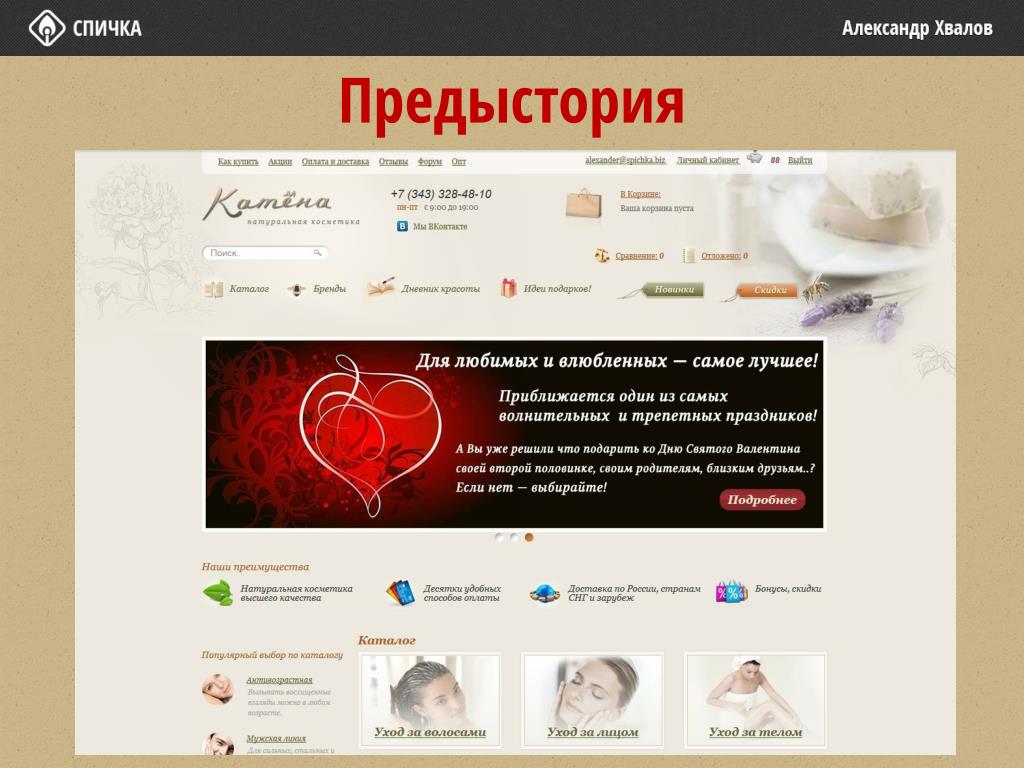 Продвижение интернет-магазина косметики katyena.ru. Предыстория. Предыстория. На начало продвижения Возраст домена: 4 года 4 месяца Возраст сайта: 6 месяцев тИЦ : 0 PR: 0. Сведения о посещаемости. Посещаемость с поиска: 973 визита в месяц Посещаемость с рекламы: 1150 визитов в месяц