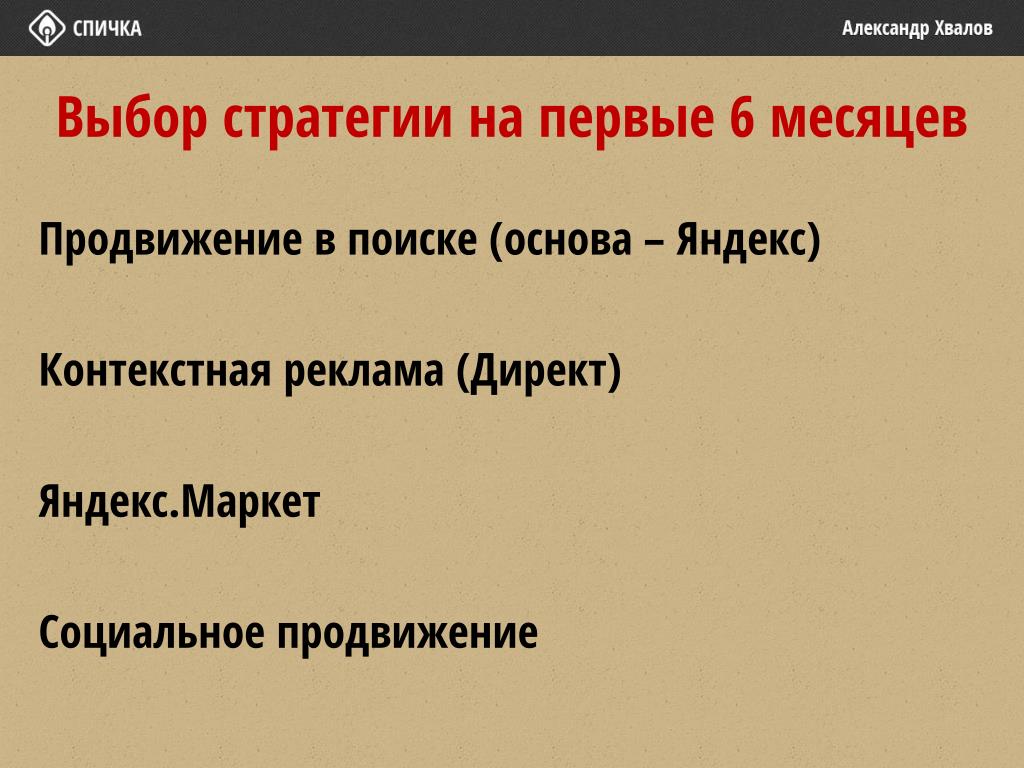 Выбор стратегии на первые 6 месяцев Продвижение в поиске (основа – Яндекс) Контекстная реклама (Директ) Яндекс.Маркет Социальное продвижение