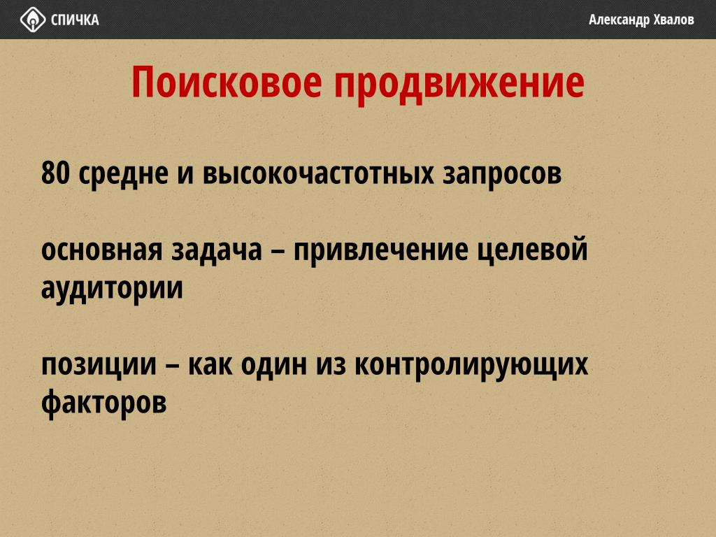 Поисковое продвижение 80 средне и высокочастотных запросов основная задача – привлечение целевой аудитории позиции – как один из контролирующих факторов