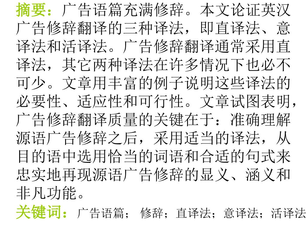 摘要:广告语篇充满修辞。本文论证英汉 广告修辞翻译的三种译法,即直译法、意 译法和活译法。广告修辞翻译通常采用直 译法,其它两种译法在许多情况下也必不 可少。文章用丰富的例子说明这些译法的 必要性、适应性和可行性。文章试图表明, 广告修辞翻译质量的关键在于:准确理解 源语广告修辞之后,采用适当的译法,从 目的语中选用恰当的词语和合适的句式来 忠实地再现源语广告修辞的显义、涵义和 非凡功能。 关键词:广告语篇; 修辞;直译法;意译法;活译法