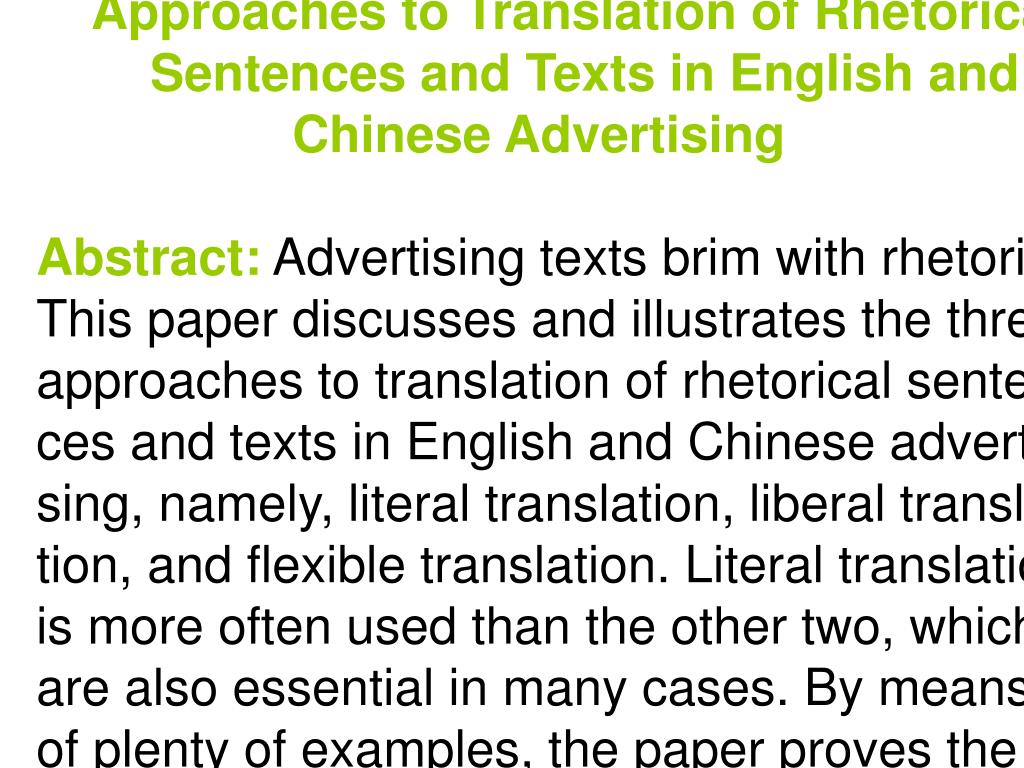 Approaches to Translation of Rhetorical Sentences and Texts in English and Chinese Advertising Abstract: Advertising texts brim with rhetoric. This paper discusses and illustrates the three approaches to translation of rhetorical senten- ces and texts in English and Chinese adverti- sing, namely, literal translation, liberal transla- tion, and flexible translation. Literal translation is more often used than the other two, which are also essential in many cases. By means of plenty of examples, the paper proves the