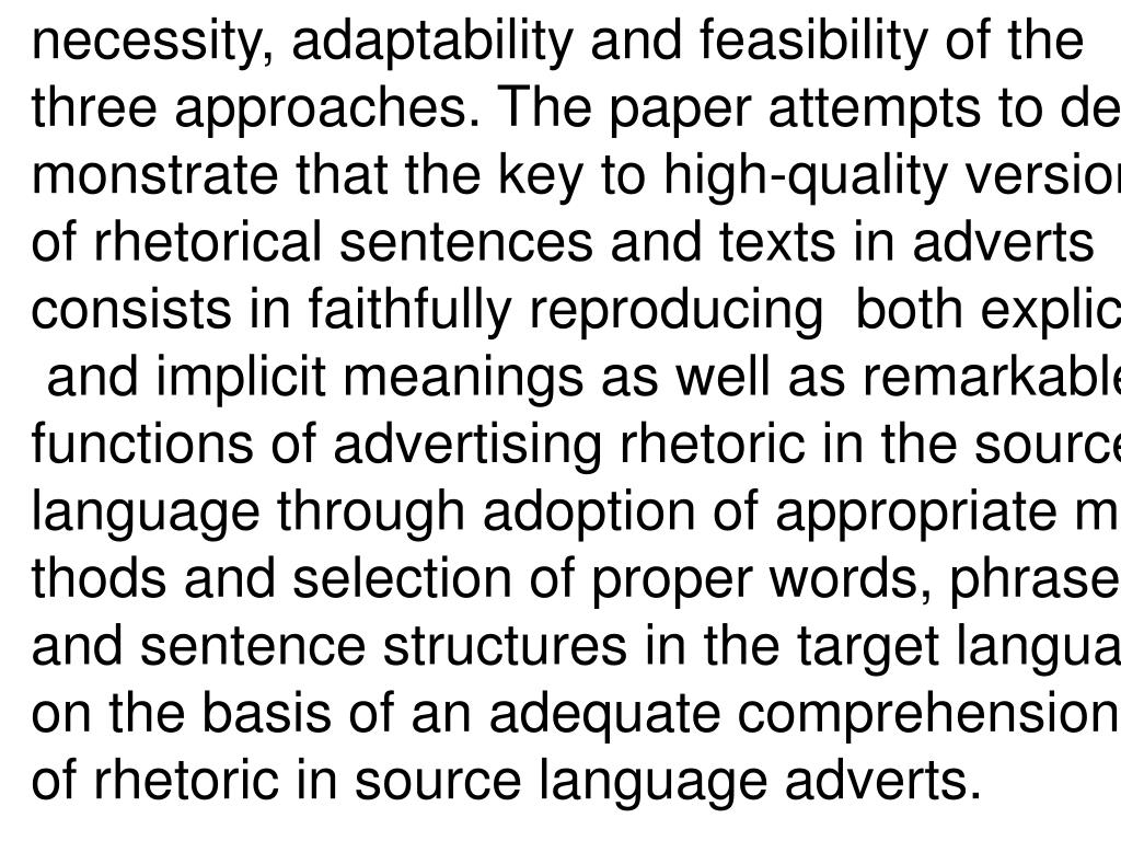 necessity, adaptability and feasibility of the three approaches. The paper attempts to de- monstrate that the key to high-quality versions of rhetorical sentences and texts in adverts consists in faithfully reproducing both explicit and implicit meanings as well as remarkable functions of advertising rhetoric in the source language through adoption of appropriate me- thods and selection of proper words, phrases and sentence structures in the target language on the basis of an adequate comprehension of rhetoric in source language adverts.