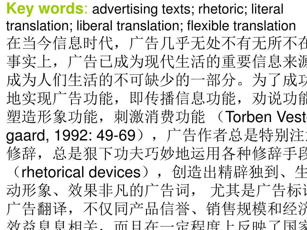 Key words:advertising texts; rhetoric; literal translation; liberal translation; flexible translation 在当今信息时代,广告几乎无处不有无所不在。 事实上,广告已成为现代生活的重要信息来源, 成为人们生活的不可缺少的一部分。为了成功 地实现广告功能,即传播信息功能,劝说功能, 塑造形象功能,刺激消费功能 (Torben Vester- gaard, 1992: 49-69),广告作者总是特别注意 修辞,总是狠下功夫巧妙地运用各种修辞手段 (rhetorical devices),创造出精辟独到、生 动形象、效果非凡的广告词, 尤其是广告标语。 广告翻译,不仅同产品信誉、销售规模和经济 效益息息相关,而且在一定程度上反映了国家