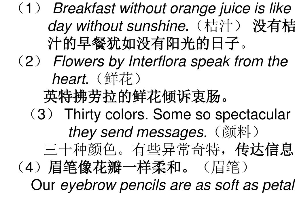(1) Breakfast without orange juice is like a day without sunshine.(桔汁) 没有桔 汁的早餐犹如没有阳光的日子。 (2) Flowers by Interflora speak from the heart.(鲜花) 英特拂劳拉的鲜花倾诉衷肠。 (3) Thirty colors. Some so spectacular they send messages.(颜料) 三十种颜色。有些异常奇特,传达信息。 (4)眉笔像花瓣一样柔和。(眉笔) Our eyebrow pencils are as soft as petals.
